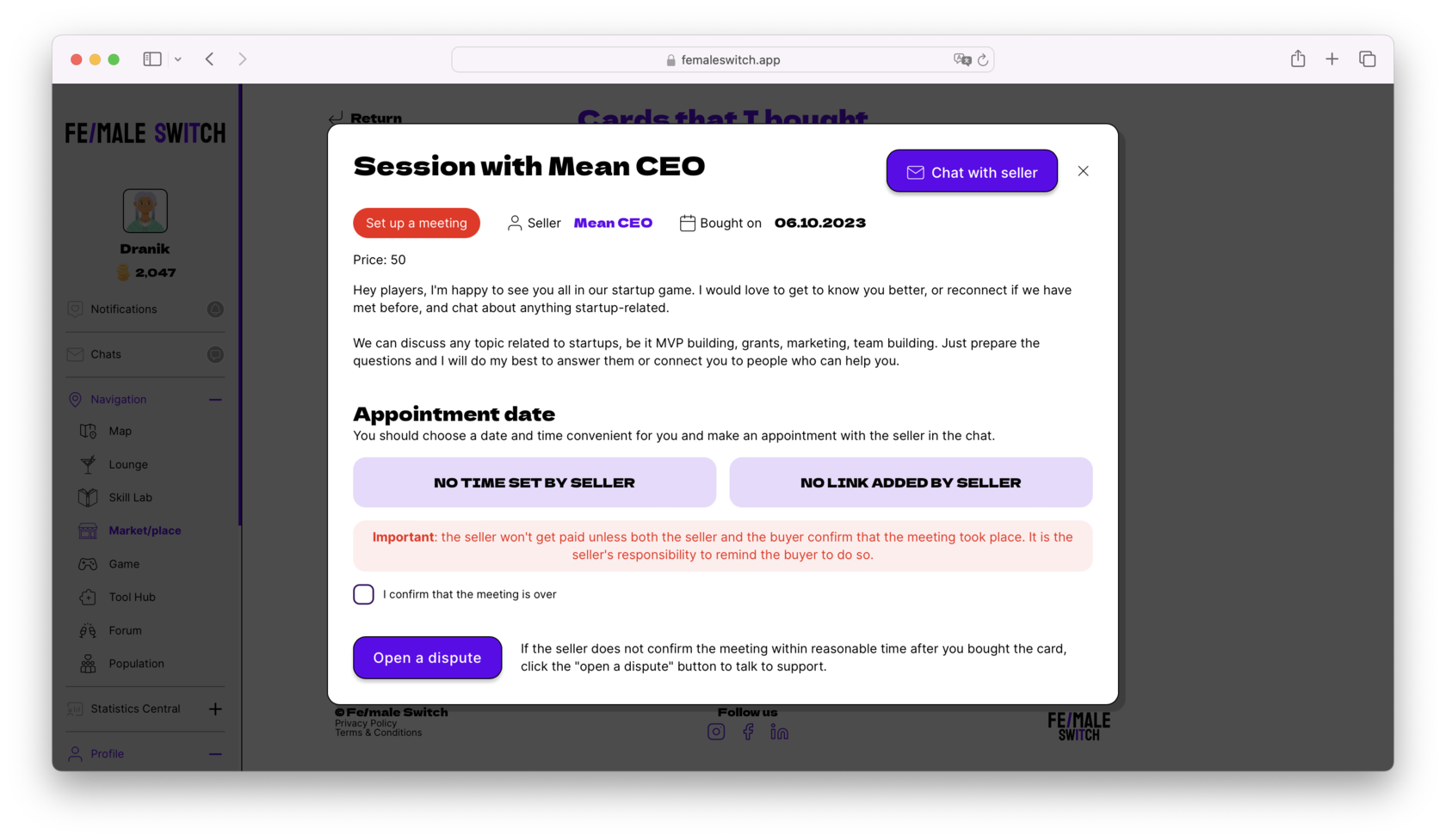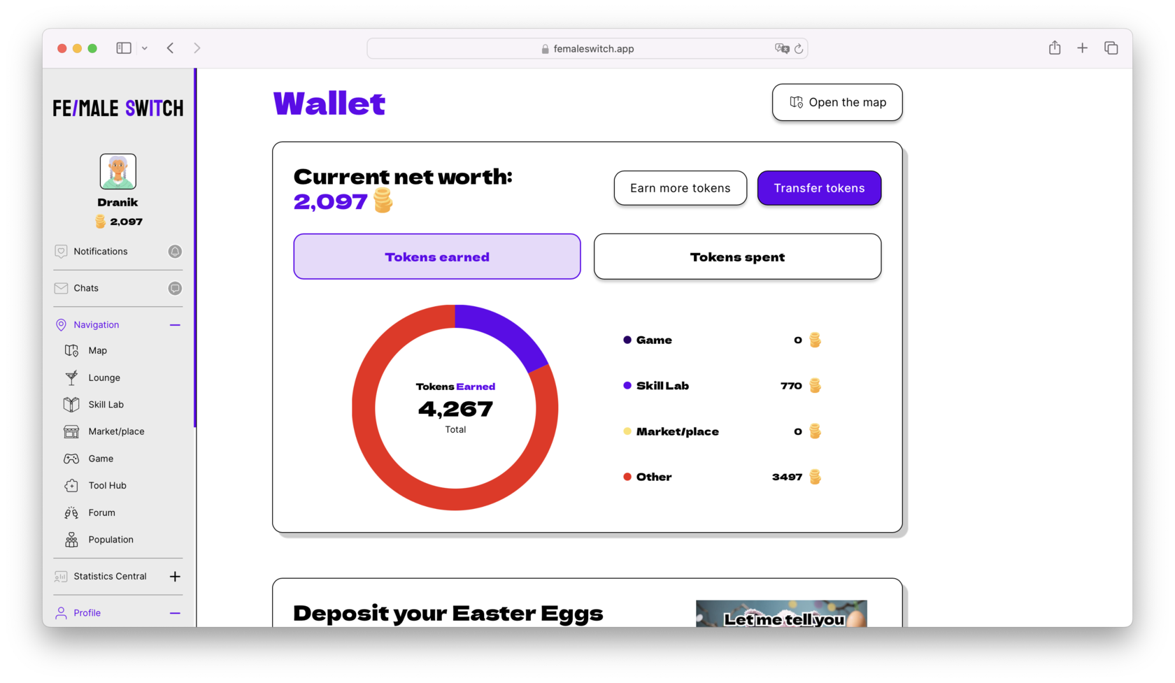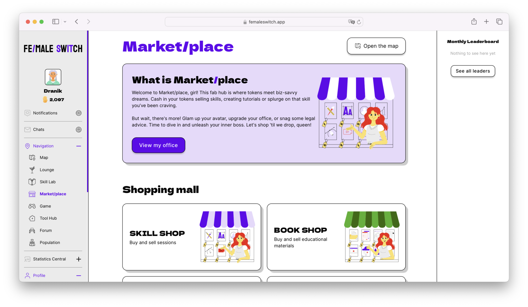 Earn and spend tokens in the Market/place. Create new cards with useful materials, sell one-on-one meetings. Buy new unique things, which you can try on before buying.