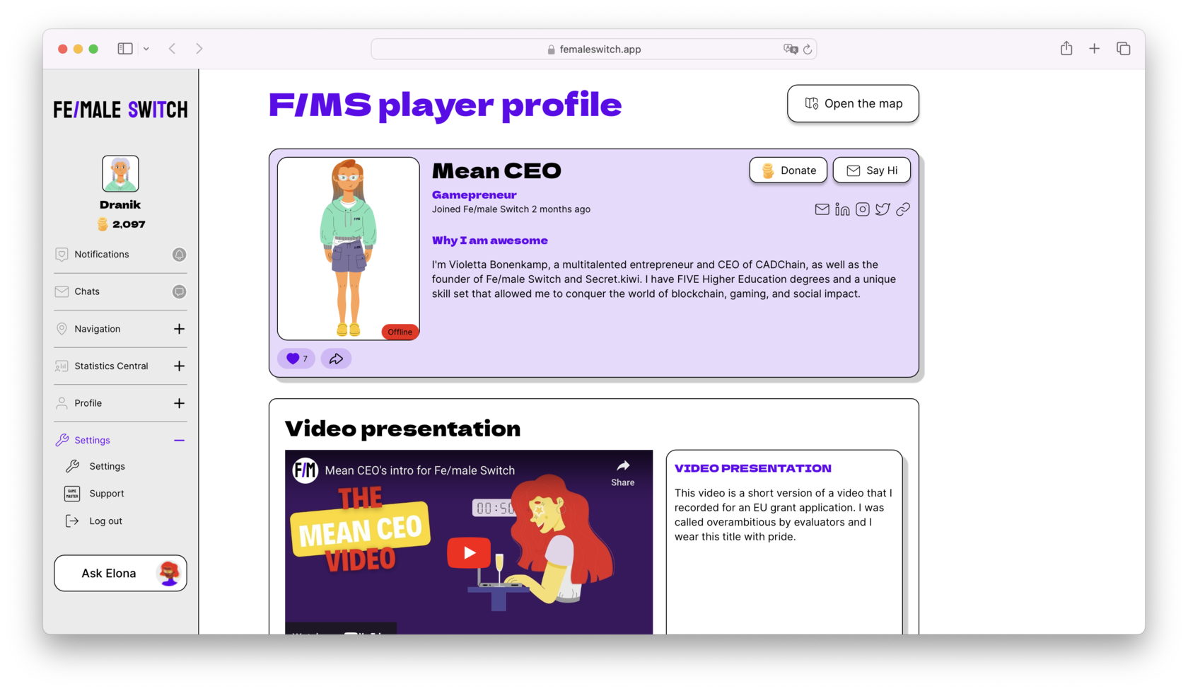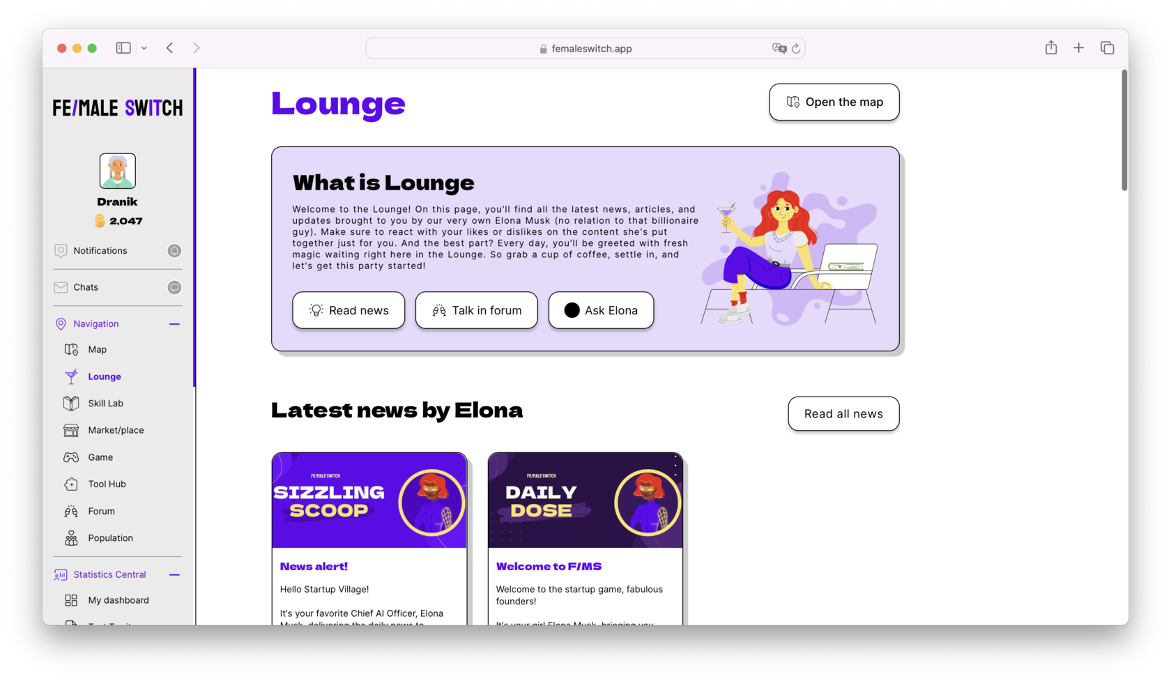 In the Lounge, you can always track your overall progress in the platform, read the latest news written by Elona Musk.